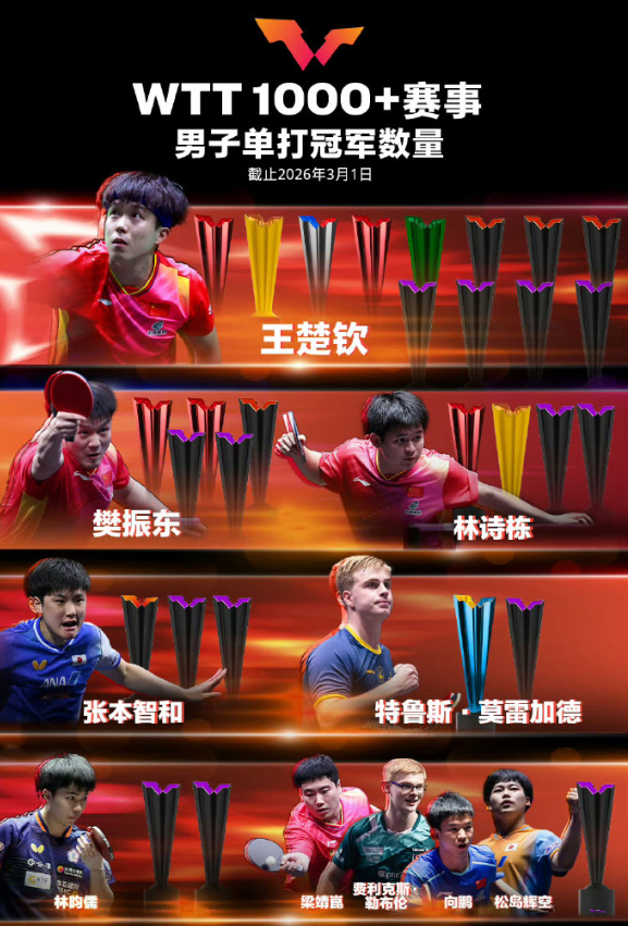 WTT官方更新了1000+冠军赛事的冠军次数,王楚钦12次断崖第一,樊振东5次,林诗栋4次,张本智和3次,莫雷加德2次,林昀儒2次,梁靖崑/小勒/松岛辉空/向鹏1人1次。